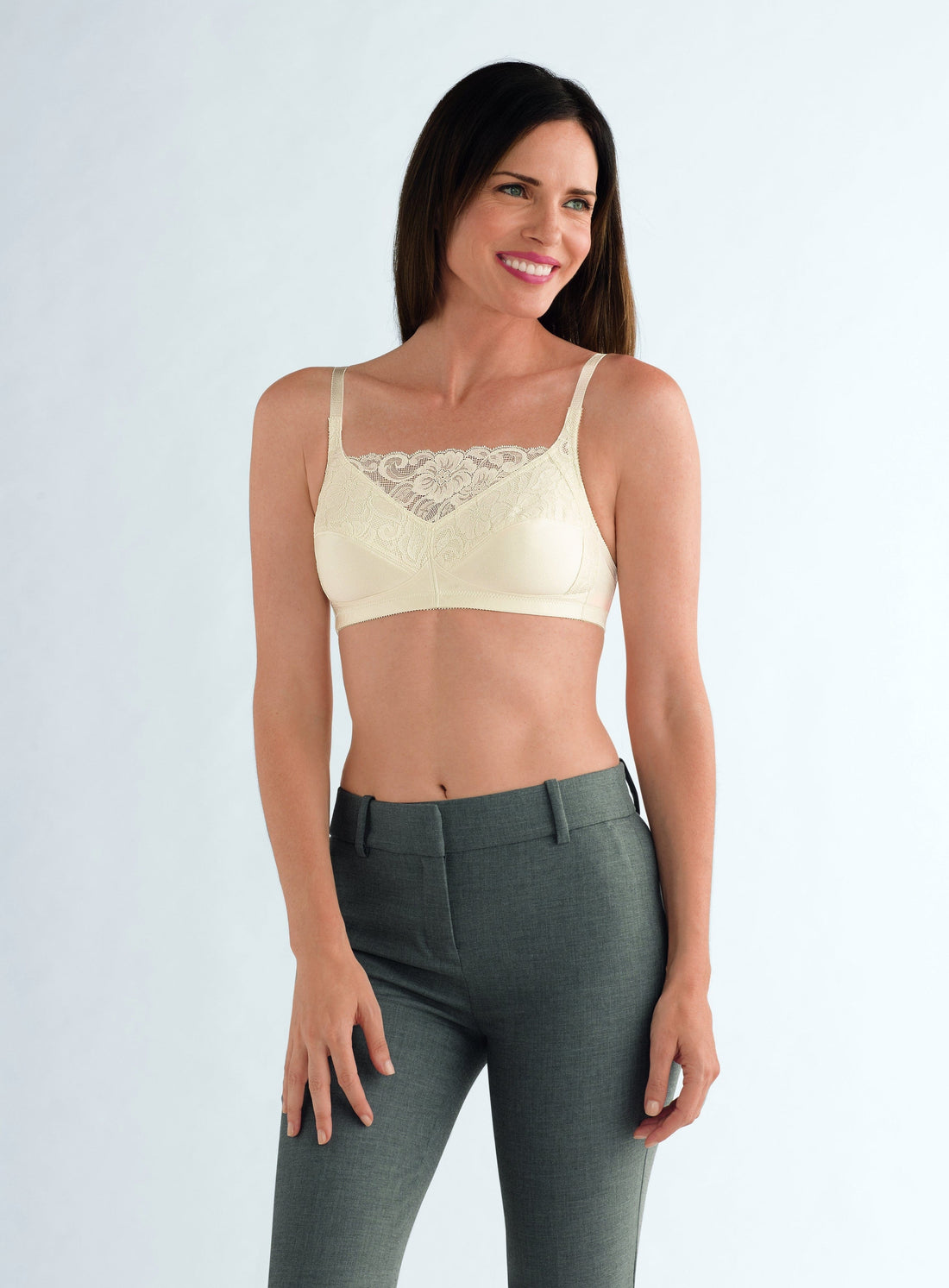 Ideal for women with high scars or for wearing with a lower neckline. This bra features an integrated lace top and thin shoulder straps.