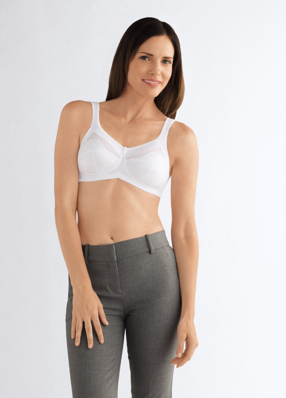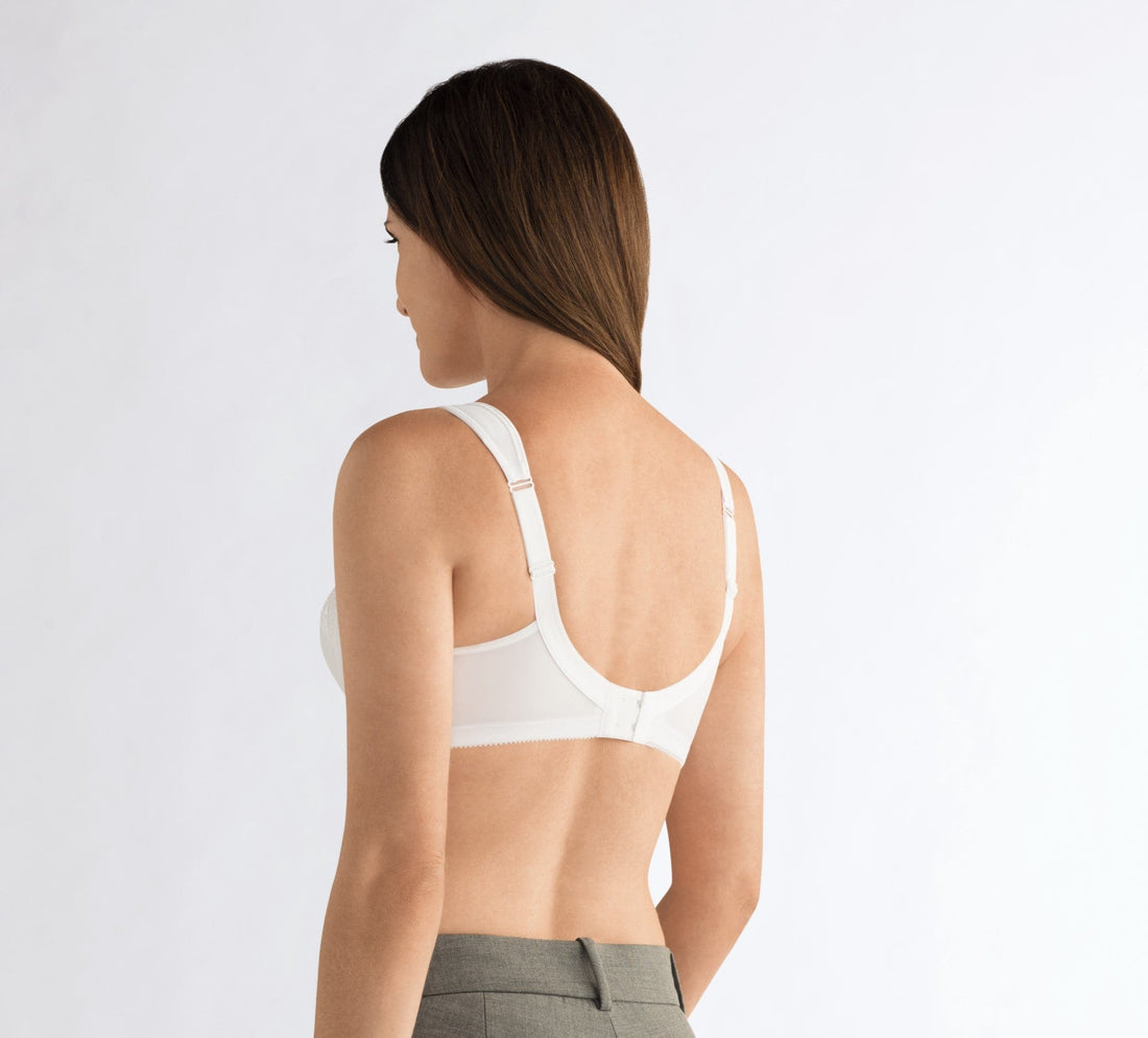 This comfortable, supportive, non-wired bra features comfortable shoulder straps and a fantastic fit. It features decorative embroidery for an elegant accent and three-section cups for a perfect fit. It offers ample support without uncomfortable sides or underarm boning. Naturally, the cups have invisible pockets for breast forms or partial breast forms.