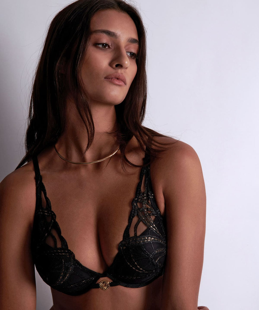 The molded cups of this push-up bra offer extra support and lift, creating a beautiful décolleté. The design is adorned with shimmering embroidery that adds subtle and refined details, often combined with gold lurex thread for a touch of glamour. This embroidery creates a luxurious look and makes the bra visually appealing.