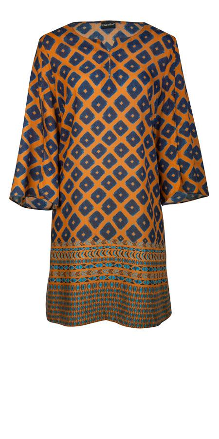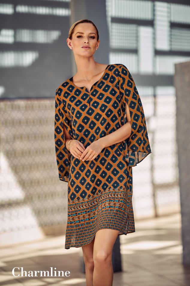 The Charmline Tobacco Fields Tunic in Tobacco Black is a fashionable tunic that combines elegance and comfort. The design is inspired by warm, natural hues and Charmline's refined style, making it an ideal choice for both casual and semi-formal occasions.