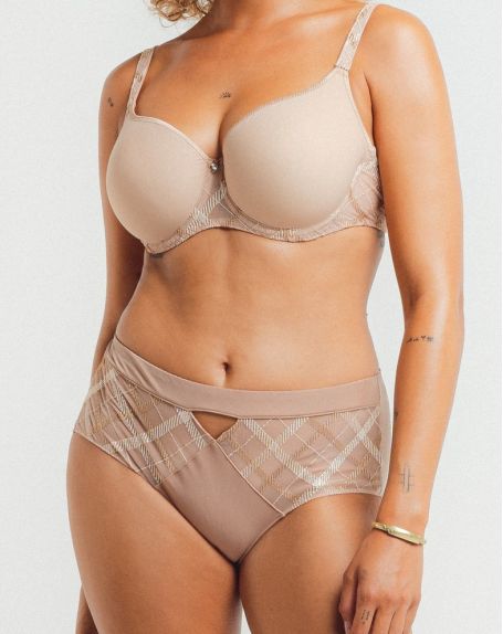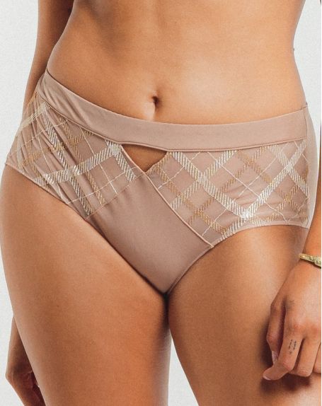 The Albanach line's Taille Slip by Louisa Bracq offers a contemporary interpretation of the 17th-century tartan motif, imitating neoclassical metallic weave.