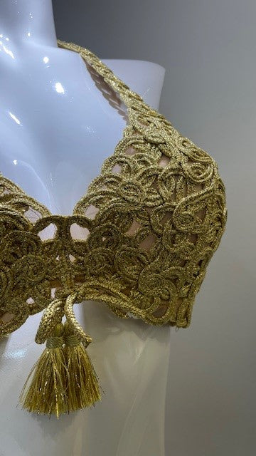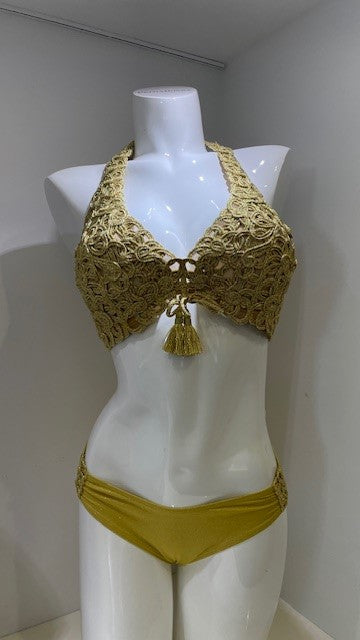 CHA is a two-piece bikini. The top is a triangle without cups that ties at the back of the neck and back. The bikini bottoms are a classic cut with embroidery on both sides.