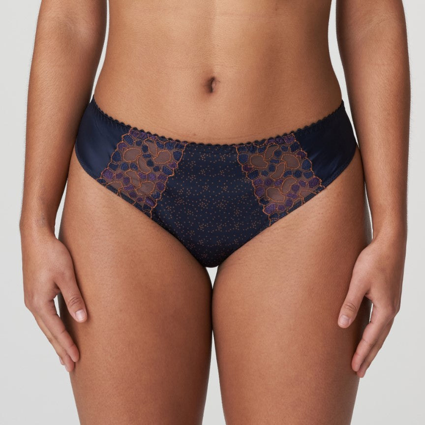 Soft printed fabric thong with vertical stripes of embroidery at the front. Velvet blue, burgundy, and bronze: Velvet Blue goes with any winter outfit.