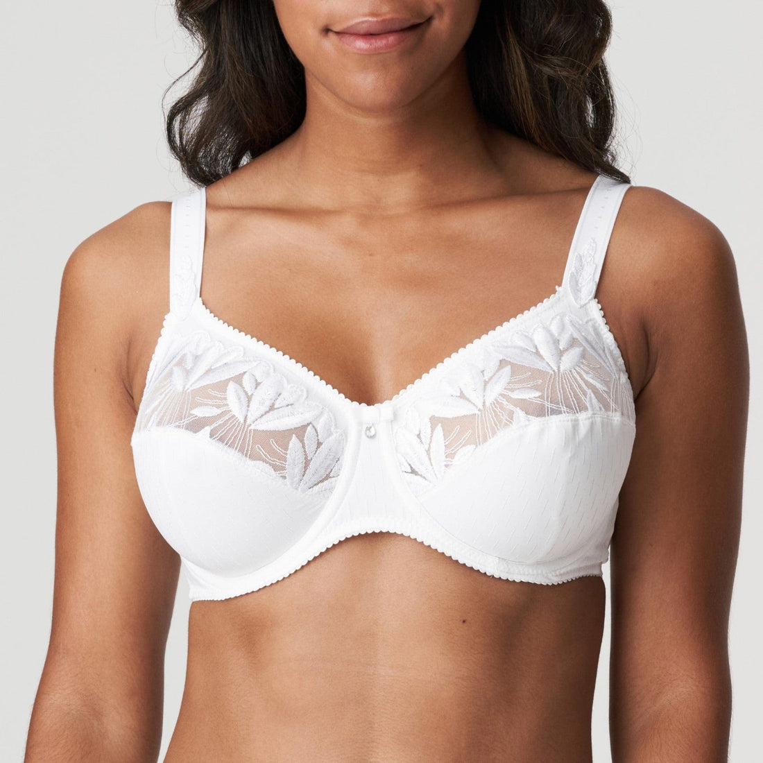 This airy comfort underwire bra beautifully envelops your breasts. The opaque cups and straps are embellished with delicate embroidery. It's incredibly comfortable! White is pure, feminine, and goes perfectly with all your summer outfits.