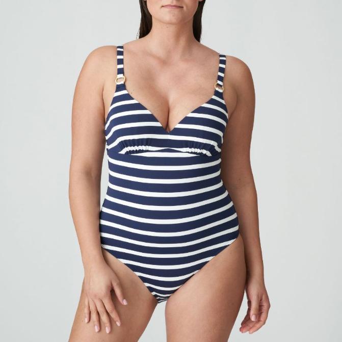 Plunge swimsuit with a flattering navy look and trendy padded triangle cups. Made entirely of striped terrycloth, the straps feature gold rings with an embossed pattern. Sporty and elegant!