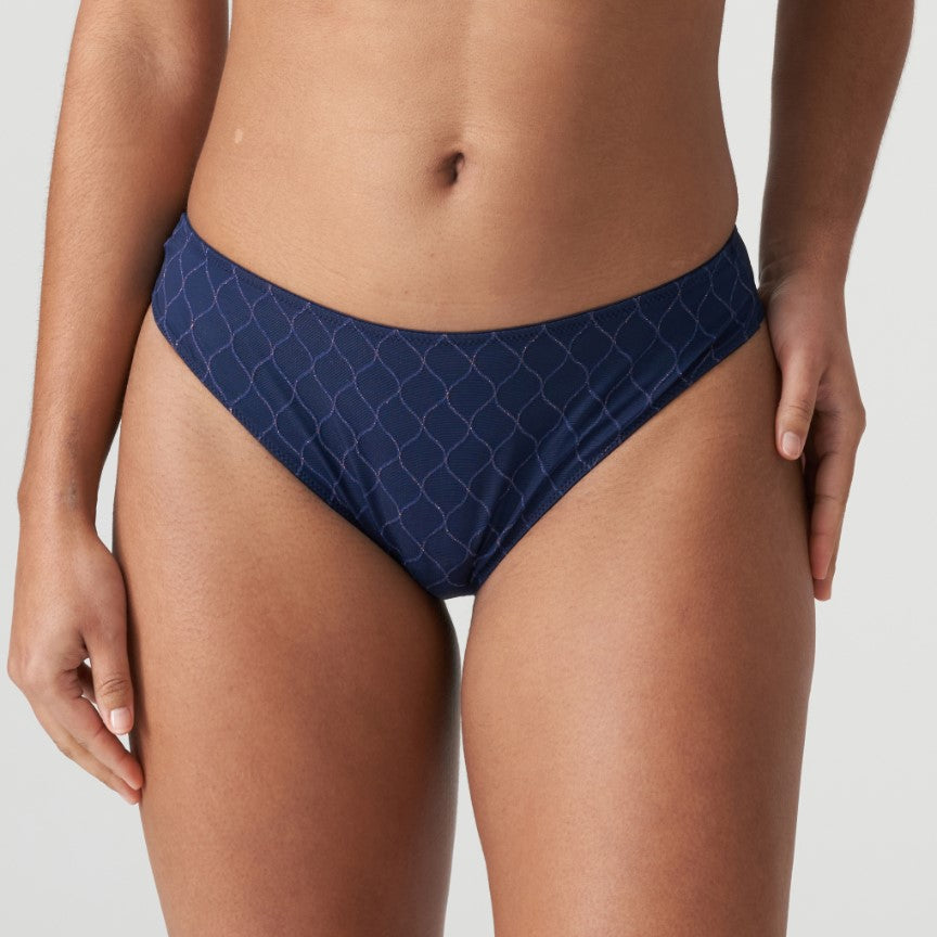 Minimalist thong in a smooth fabric, with trendy geometric lace at the legs. Timeless and chic: sapphire blue with a touch of glitter.