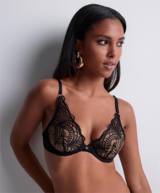 Des motifs graphiques ornent la tresse brodée. La bordure écaille apporte contraste et modernité. Une largeur graphique souligne les courbes de la broderie et laisse entrevoir la peau. Des tubes dorés ornent les brides à trois extrémités, accentuant le style bohème. Un petit pendentif doré vient sublimer la ligne.