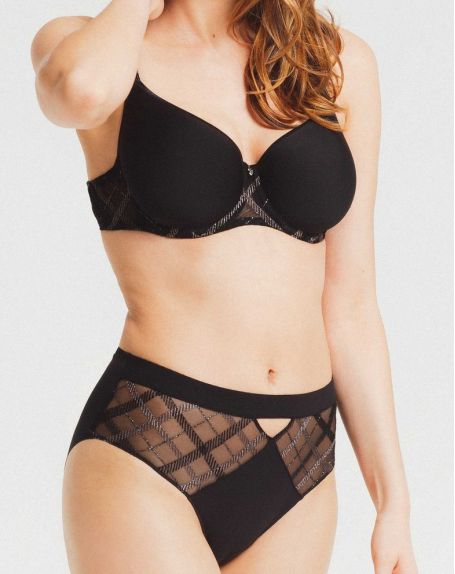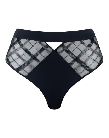 La nuisette Taille Slip de la ligne Albanach, signée Louisa Bracq, offre une interprétation contemporaine du motif tartan du XVIIe siècle, imitant le tissage métallique néoclassique.