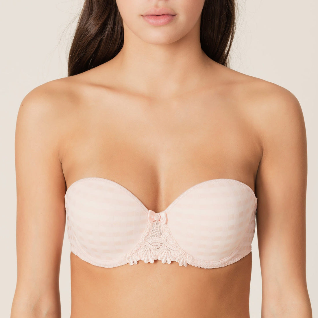 Soutien-gorge sans bretelles avec bonnets rembourrés lisses. Vous pouvez également porter le soutien-gorge sans bretelles avec les bretelles marguerites : droites ou en licou. Une sangle en silicone a été appliquée à l'arrière du soutien-gorge, afin que le soutien-gorge reste toujours en place et offre un soutien suffisant. Le rose clair espiègle est frais et estival.