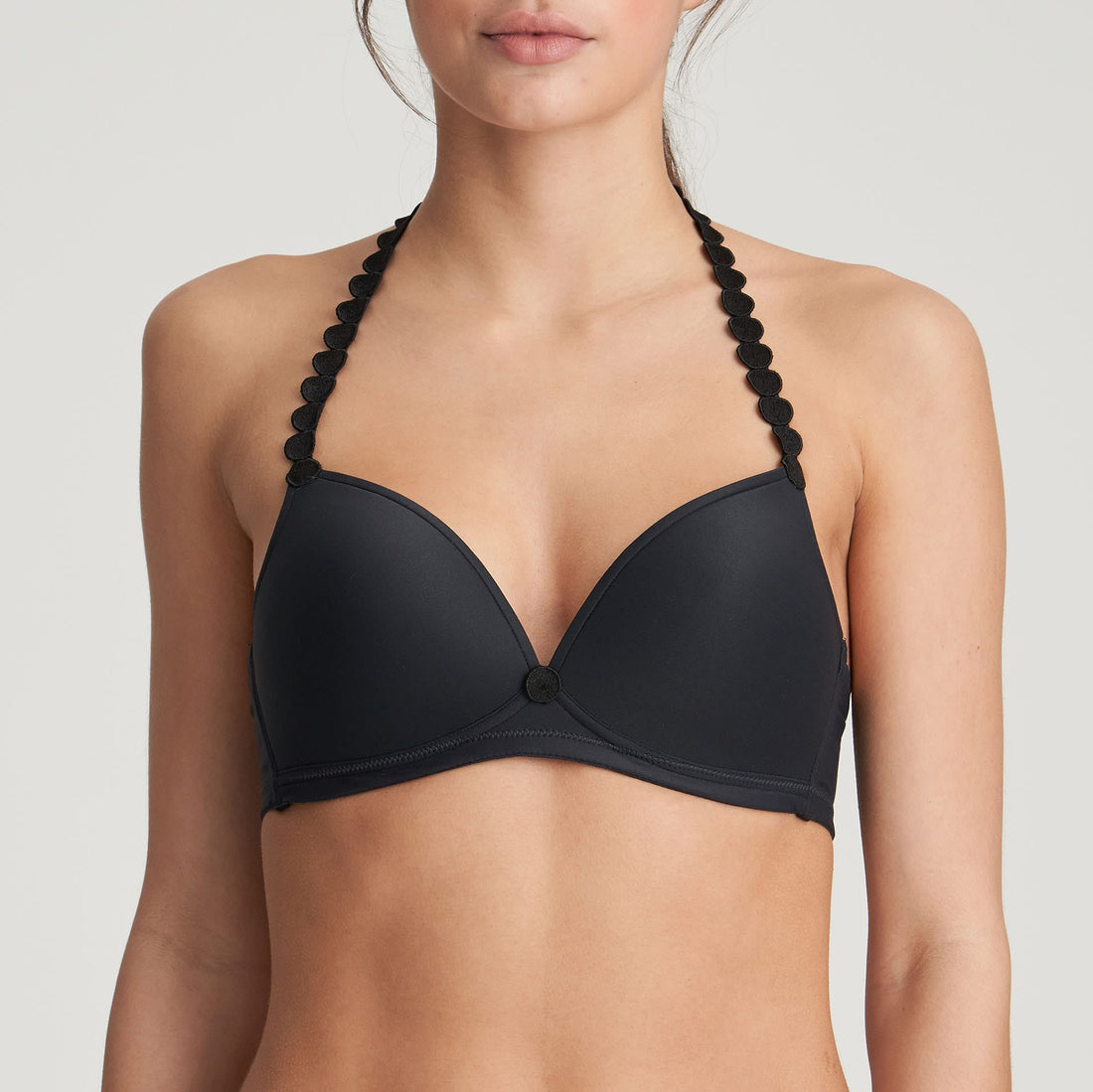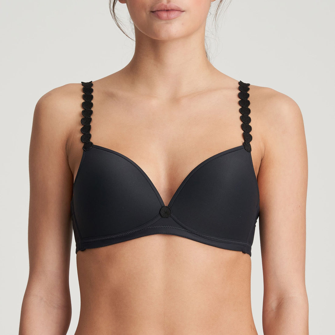 Soutien-gorge coque sans armature. Les lignes triangulaires sont innovantes, frivoles et jeunes. Vous pouvez porter les bretelles droites et autour du cou. Charbon est une douce teinte gris foncé et une alternative élégante au noir.