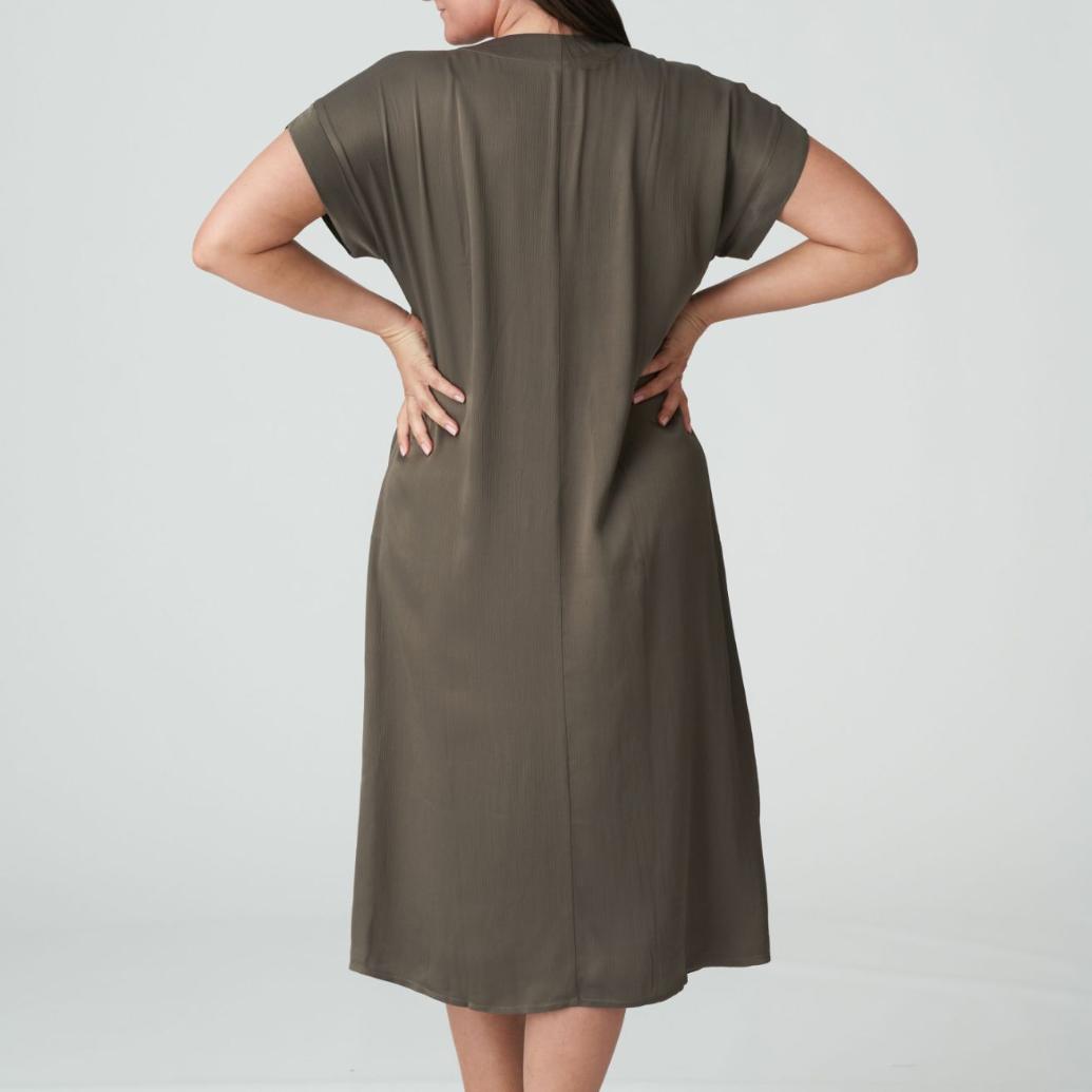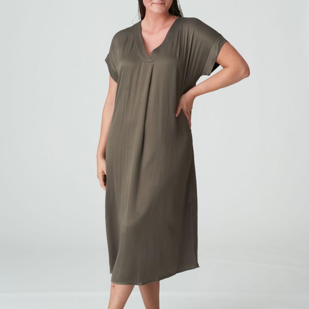 Une longue robe caftan à décolleté plongeant. Les manches courtes et larges retombent élégamment sur les épaules.