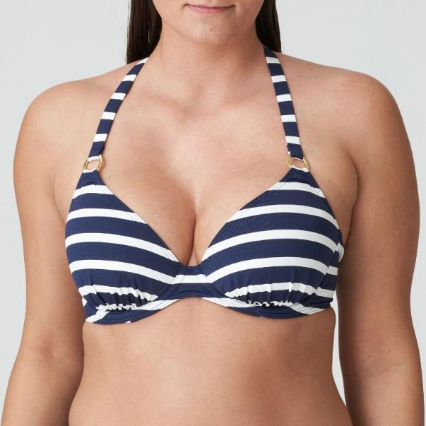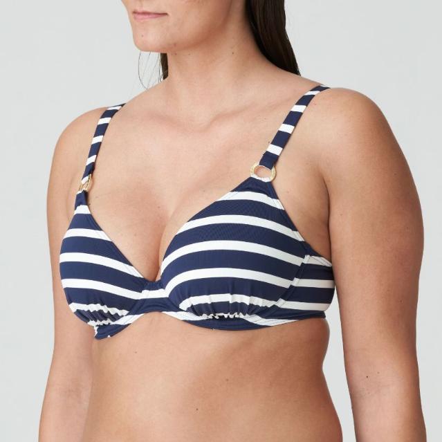 Haut de bikini plongeant d'inspiration nautique tendance, avec bonnets triangulaires rembourrés. Le haut est en tissu éponge rayé et les bretelles sont ornées d'anneaux dorés à motif en relief.