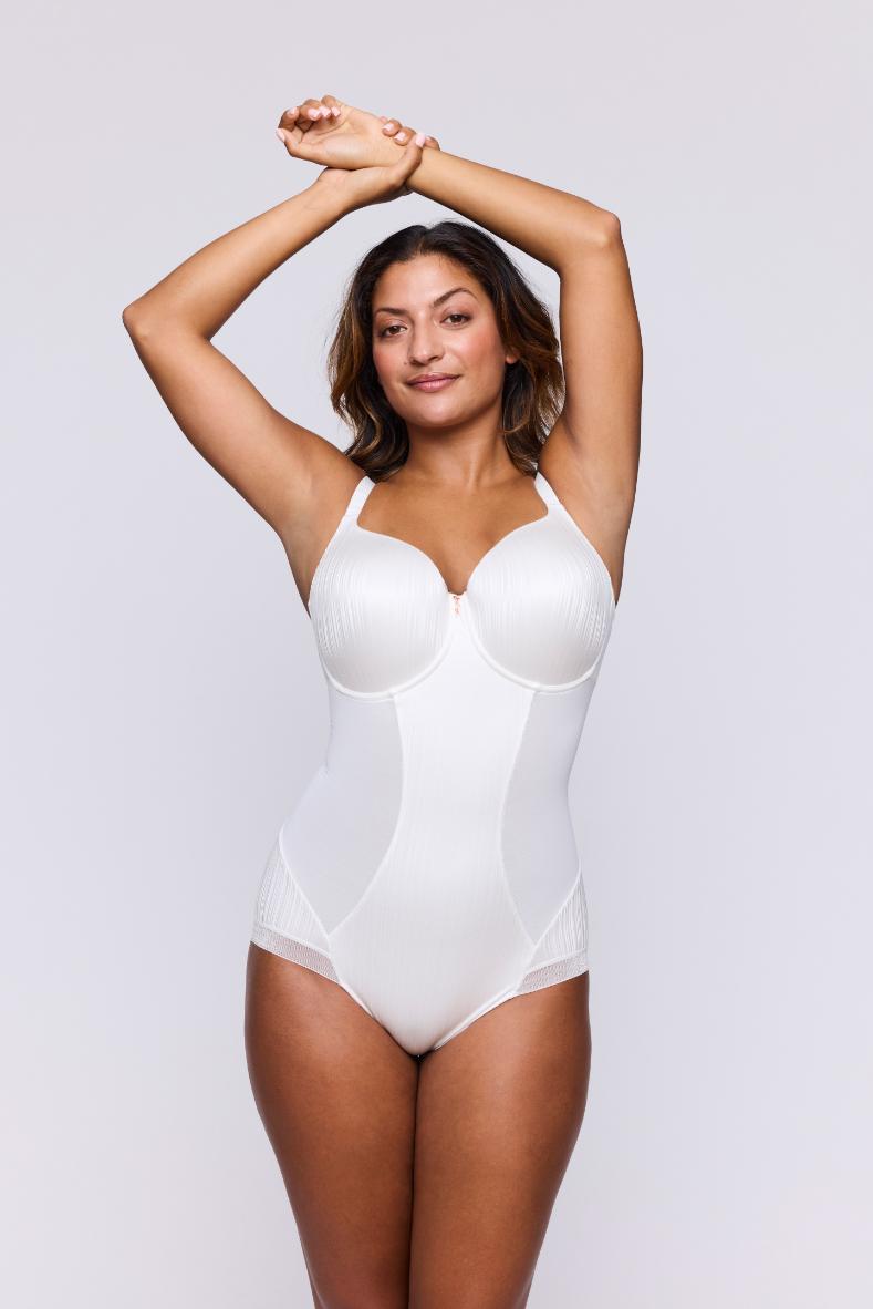 Ce body en tissu rayé scintillant et tulle est idéal pour une soirée. Invisible sous les vêtements, il peut aussi se porter comme un top sexy. Les bonnets rembourrés en forme de cœur offrent un maintien confortable à votre poitrine généreuse, tandis que les jambes en tulle et le bijou or rose au centre du devant complètent votre look sport-chic.