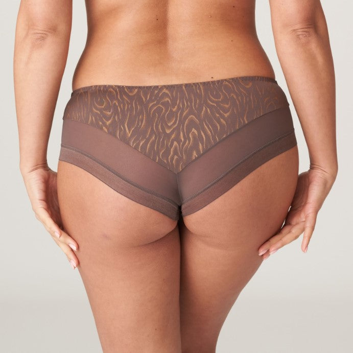 Hot pants hanche et complètement lisse en tissu satiné avec un motif zèbre doré. Le tulle sexy sur les fesses complète votre look et assure que la culotte est lisse sous vos vêtements.