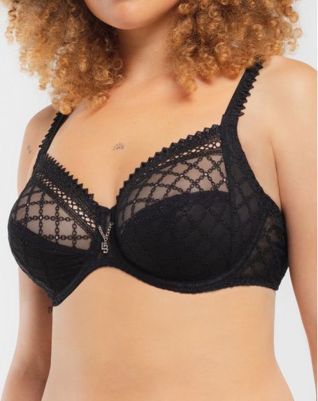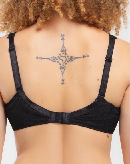 De in elkaar grijpende bh van de Paco-lijn biedt een boeiende visual dankzij het geometrische borduurwerk.