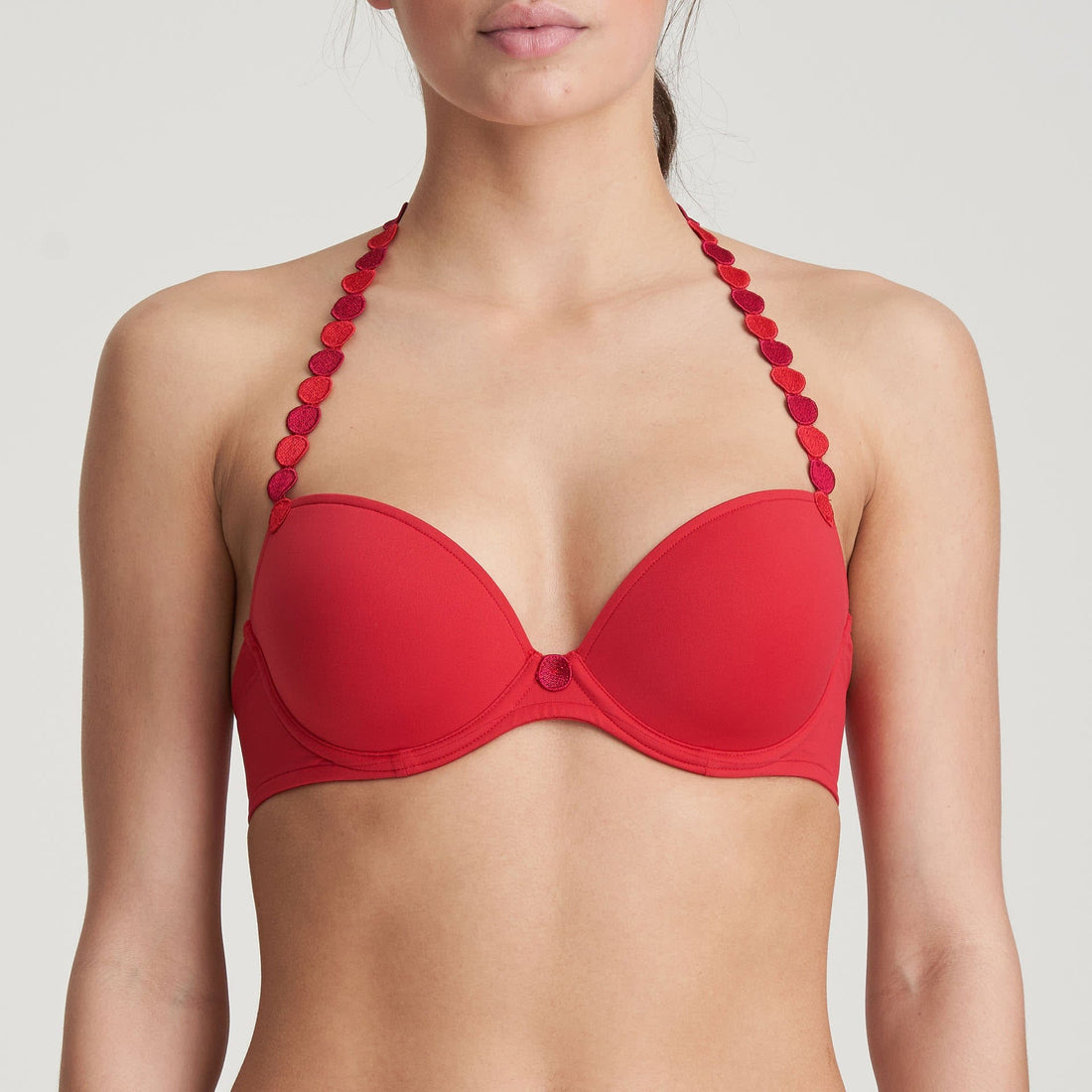 De Voorgevormde Beugel Bh met ronde heeft een diepe decolletébelijning die loopt van laag vorm in het stukje tussen de borsten in een bijna rechte lijn naar hoger opzij aan de cups. Schouderbandjes die je recht en om de hals kunnen dragen. Vurig rood brengt pit en warmte in je lingerielade. Scarlet= liefde op het eerste gezicht!