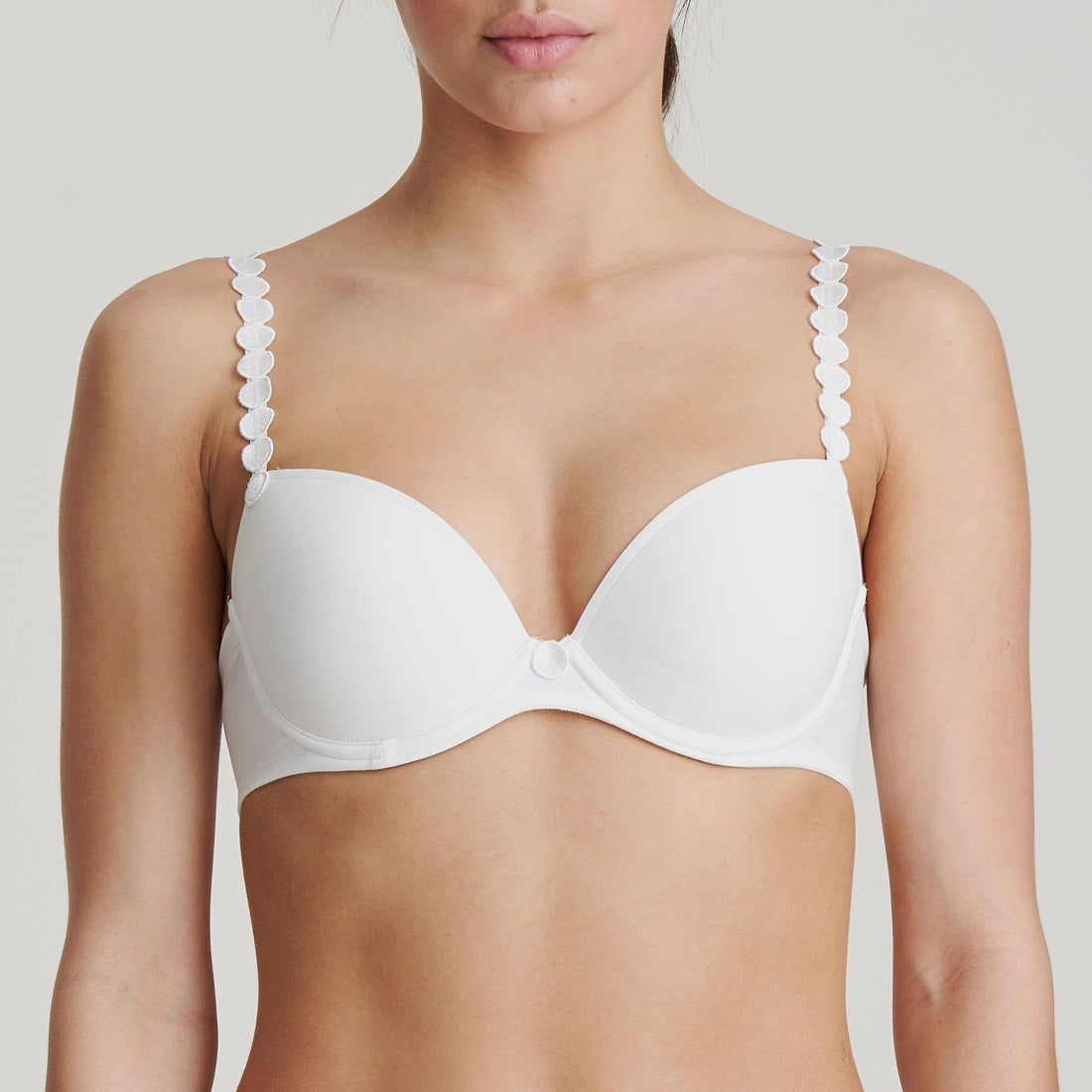 De Voorgevormde Beugel Bh met ronde heeft een diepe decolletébelijning die loopt van laag vorm in het stukje tussen de borsten in een bijna rechte lijn naar hoger opzij aan de cups. Schouderbandjes die je recht en om de hals kunnen dragen. Wit is en blijft een lingerieklassieker. De soortgelijke parelschouderbandjes geven een extra element glamour.
