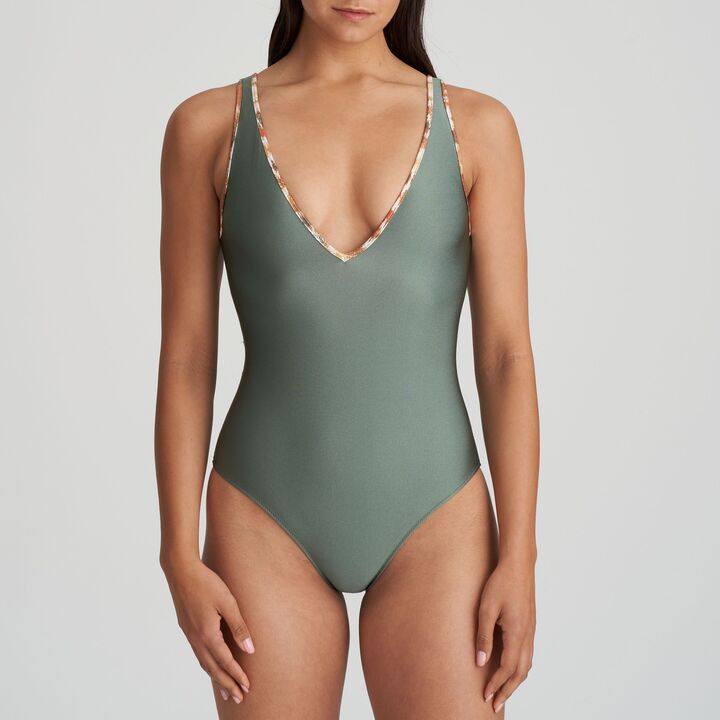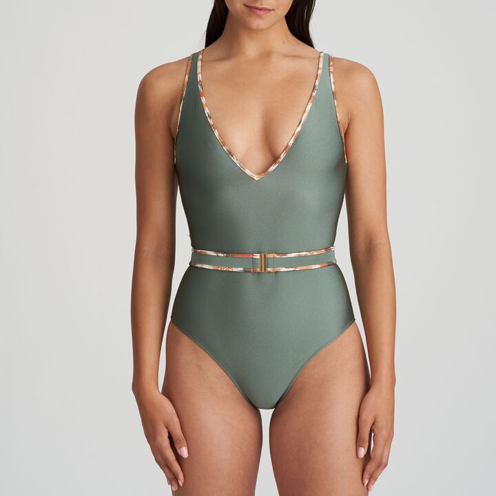 Stijlvol badpak in glanzende stof met diepe décolleté en een stijvolle riem, deze mag niet ontbreken tijdens je vakantie.