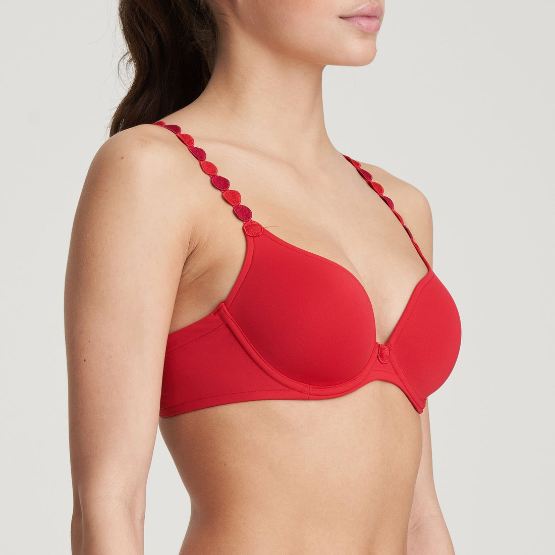Voorgevormde Beugel Bh met hartvormige cup. De cup omvat bovenaan een groot deel van de borst. De hoge decolletébelijning boven de borst loopt diep omlaag tussen de borsten. De schouderbandjes kan je recht of om de hals dragen. Vurig rood brengt pit en warmte in je lingerielade. Scarlet= liefde op het eerste gezicht!