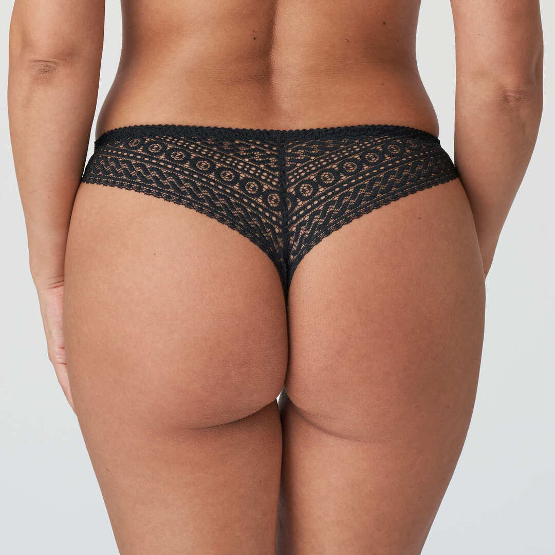 Fijne string van gesloten gladde stof, met kant op de rug.