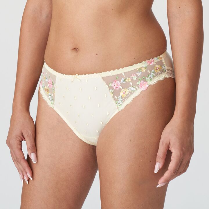 Kleurrijk rioslipje van bolletjestule met schattige bloemetjes aan de zijpanden. Glad afgewerkt met een elastiek aan de benen: snijdt niet in! French Vanilla is een zonnige vanilletint met een veelkleurig boeket van veldbloemetjes.