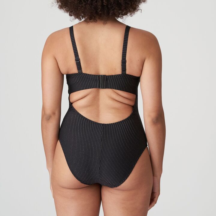 Stijlvol badpak in badstof met glitterstrepen, met een extra diep rugdecolleté en een hoge beenuitsnijding. Je draagt het met één of twee straps. Sexy en stylish!