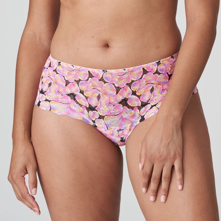 Sexy hotpants in kleurrijk bedrukte, gerecycleerde kant: luchtig en transparant, zonder dubbeling.