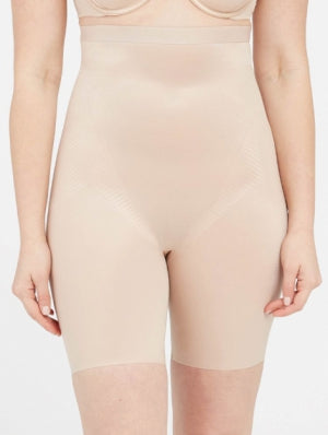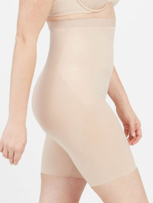 Ultradun! Met deze nieuwe short van Spanx zeg je 'Ja' tegen een gestroomlijnd en perfect silhouet! Het ultradunne materiaal zorgt voor een glad resultaat en biedt tegelijkertijd de juiste correctie. Dit broekje heeft een comfortabele tailleband en blijft daardoor perfect op zijn plek zitten. De short heeft een corrigerend buikpaneel met daar om heen een vernieuwend, ingeweven streep-patroon. Doordat het broekje een stevige en dunne kwaliteit heeft, is deze super te dragen onder elk outfit.