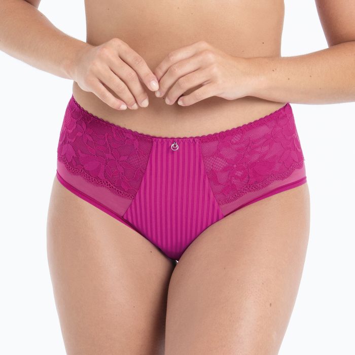 De elegante tailleslip+ Sita pakt het dessin van Sita-serie op: all-over elastische strepen worden afgewerkt met elastisch kant en transparante tule, terwijl de achterkant klassiek minimalistisch en ondoorzichtig is. Een glanzende sierhanger, een zachte, elastische tailleband en platte zoom langs de beenopeningen ronden het draagcomfort en de subtiele look onder nauwsluitende kleding af.